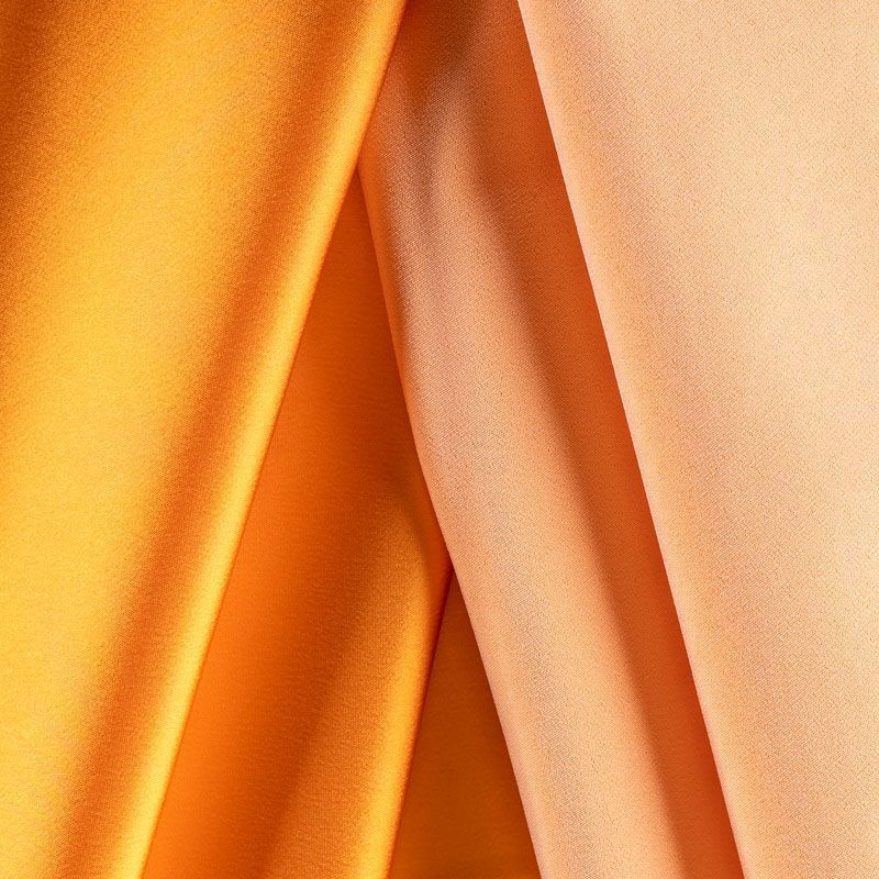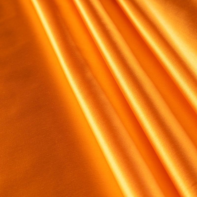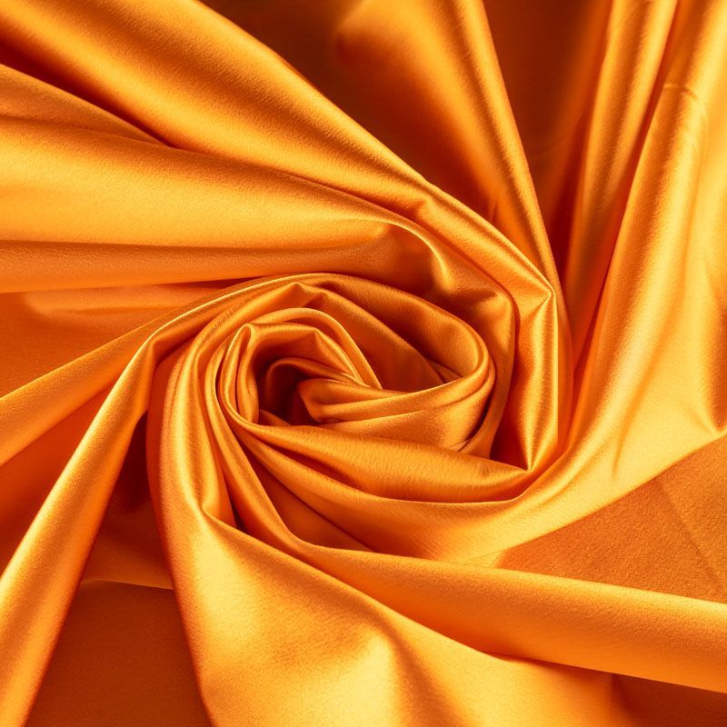 Итальянский костюмно-плательный атлас ватуссо апельсинового оттенка. Ткань плотная, но пластичная, хорошо держит форму и отлично тянется, собирается в красивые складки и драпировки. Почти не мнется, очень удобный и практичный. Блеск умеренный, смотрится дорого, благородно. Подойдет для пошива прямых силуэтов-футляров, приталенных платьев с пышной юбкой и крупными драпировками, изделий с заложенными складками, нарядных изделий, вечерних костюмов, летнего пальто, юбки, для изготовления корсетов.