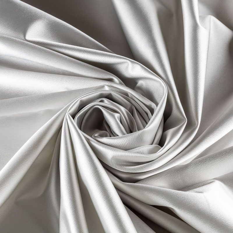 Итальянский костюмно-плательный атлас ватуссо светло-серого цвета с жемчужным оттенком. Ткань плотная, но пластичная, хорошо держит форму и отлично тянется, собирается в красивые складки и драпировки. Почти не мнется, очень удобный и практичный. Блеск умеренный, смотрится дорого, благородно. Подойдет для пошива прямых силуэтов-футляров, приталенных платьев с пышной юбкой и крупными драпировками, изделий с заложенными складками, нарядных изделий, вечерних костюмов, летнего пальто, юбки, для изготовления корсетов.