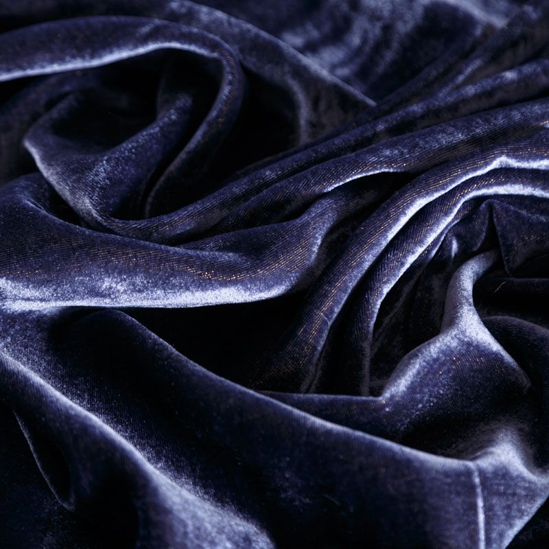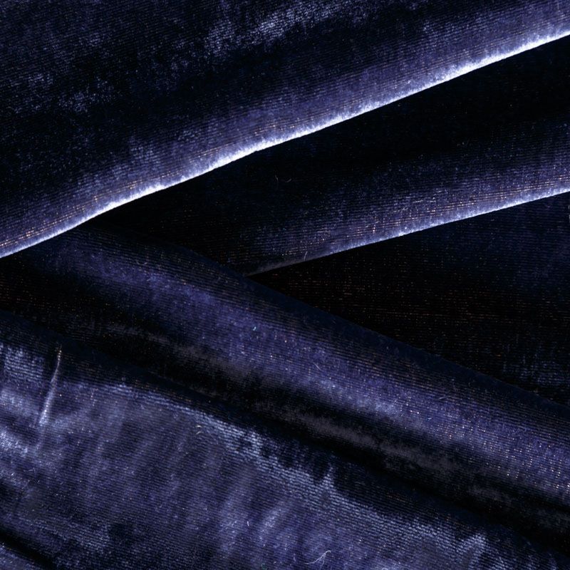 Итальянский шелковый бархат фиолетово-синего оттенка с золотистым едва заметным напылением. Ткань легкая, пластичная, мягкая, с коротким и блестящим ворсом, имеющим направление, очень приятная на ощупь, прекрасно драпируется. Подойдет для платья, юбки, туники, блузки, комбинезона, свободных брюк и костюма свободного кроя.