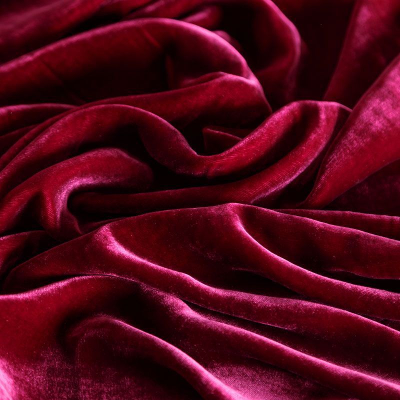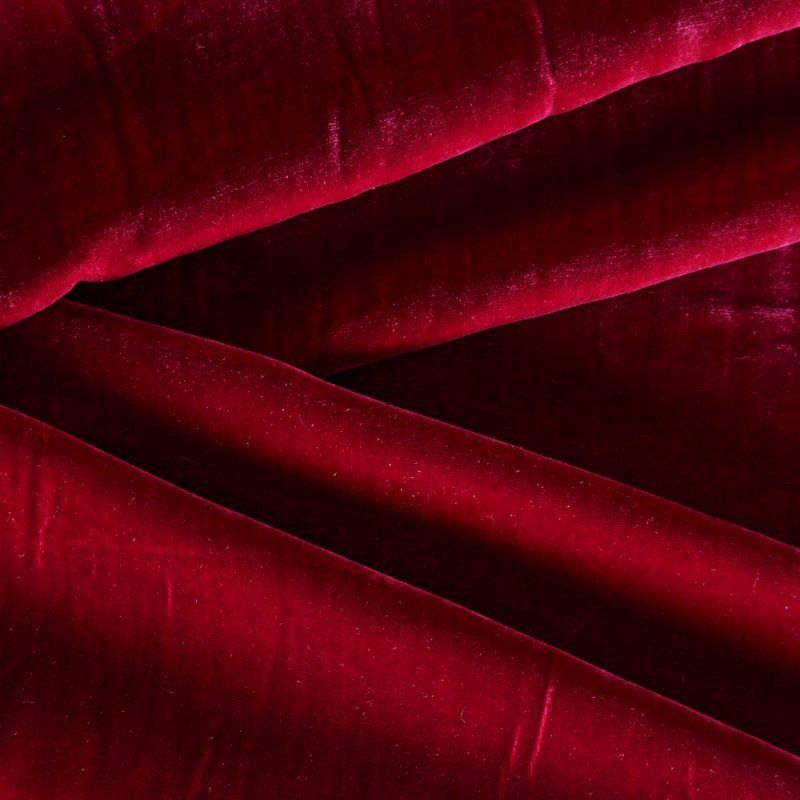 Итальянский бархат на шелковой основе в благородном рубиновом оттенке. Ткань легкая, пластичная, мягкая, с коротким и блестящим ворсом, имеющим направление, очень приятная на ощупь, прекрасно драпируется. Подойдет для платья, юбки, туники, блузки, комбинезона, свободных брюк и костюма свободного кроя.