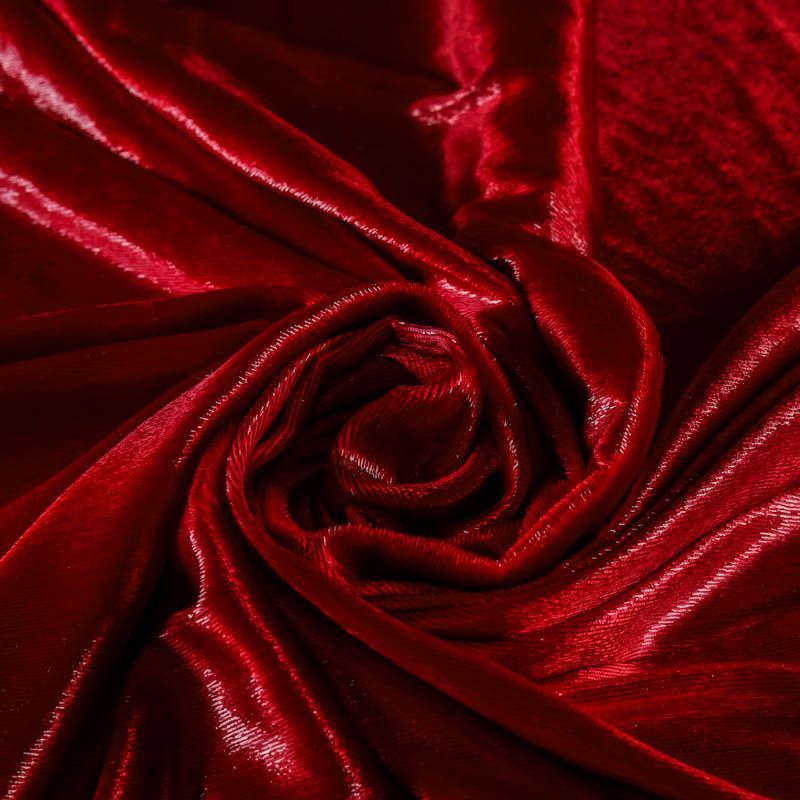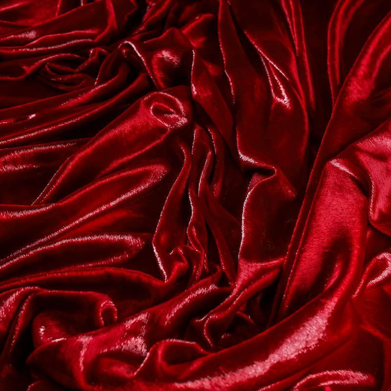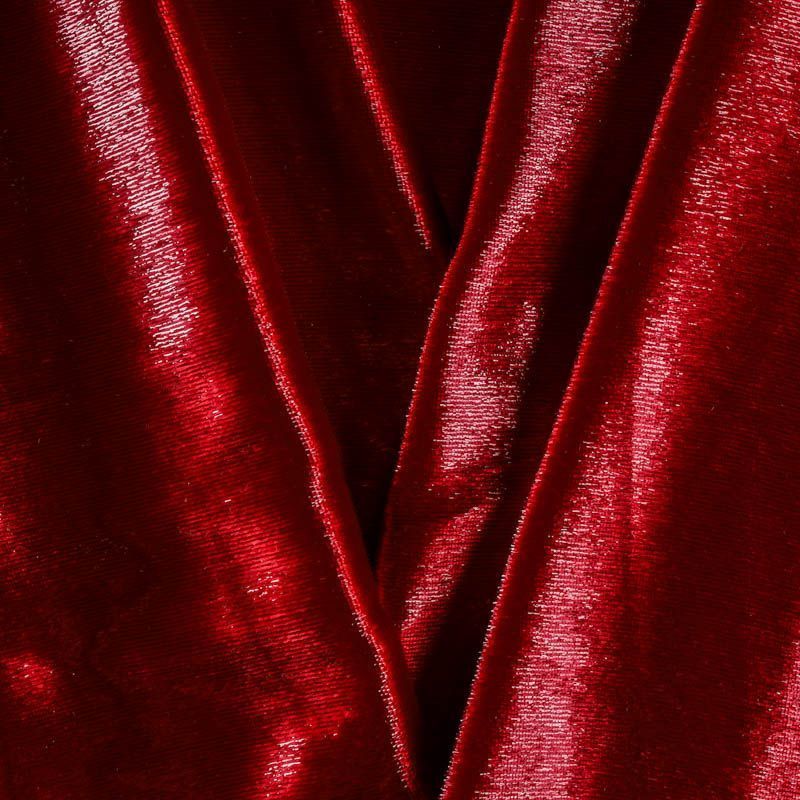Бархат с небольшим ворсом насыщенного красного цвета с эффектом люрекса. Ткань очень приятна на ощупь, не мнется, мягкая, нежная, хорошо тянется и драпируется. Цвет играет отблесками и полутонами. Бархат идеально подходит для пошива вечерних платьев, юбок, костюмов, а также стильных аксессуаров.