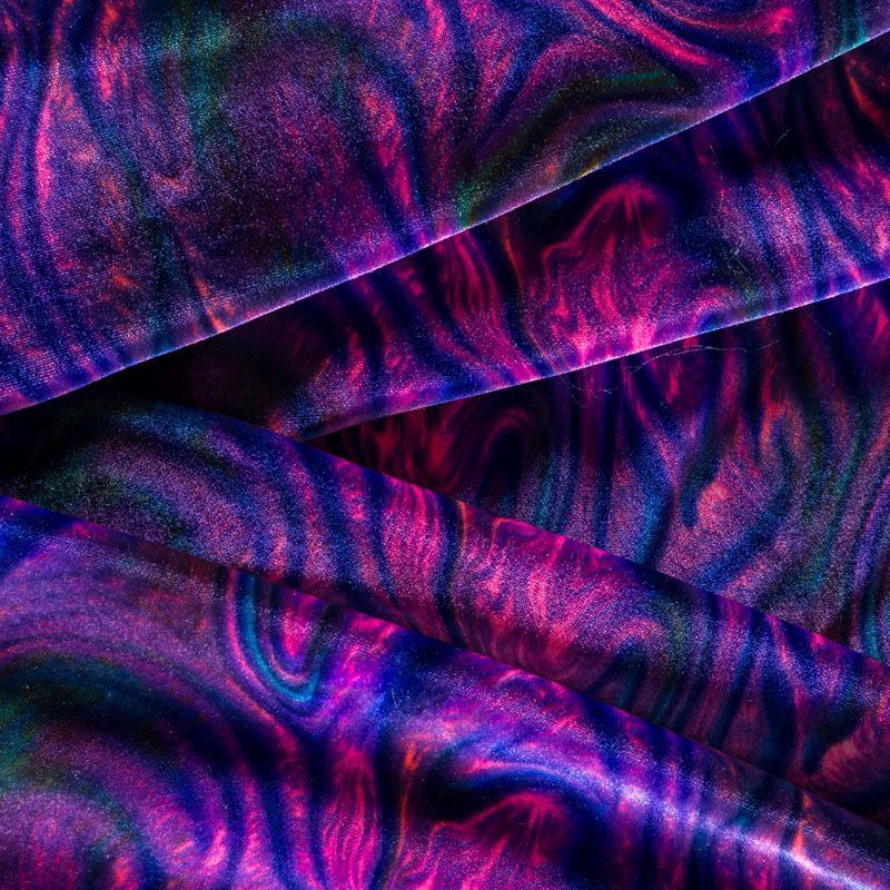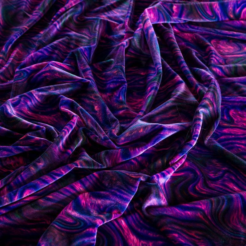 Пластичный, мягкий бархат с абстрактным дизайном в фиолетово-розовых оттенках. Ткань очень приятна на ощупь, не мнется, хорошо тянется за счет эластана в составе и драпируется. Цвет играет отблесками и полутонами. Бархат идеально подходит для пошива вечерних платьев, юбок, костюмов, а также стильных аксессуаров.