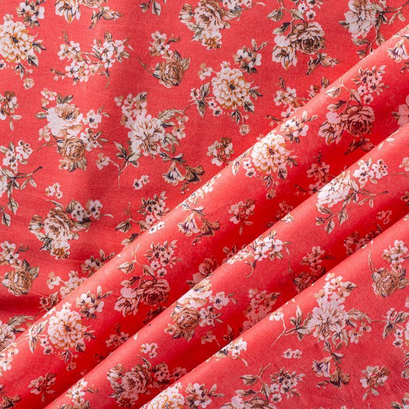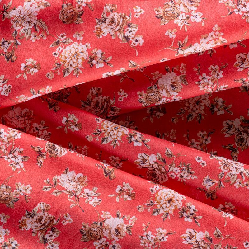 Итальянский хлопковый батист с мелким цветочным принтом в бежево-коричневых оттенках на коралловом фоне. Ткань очень легкая, прозрачная, приятная на ощупь, нежная, пластичная, хорошо и мягко драпируется, летящая. Батист подойдёт для модных блуз с объёмными рукавами, летних платьев и сарафанов с длинной летящей юбкой, прозрачных рубашек, декорированных объёмными бантами, туник и топов.