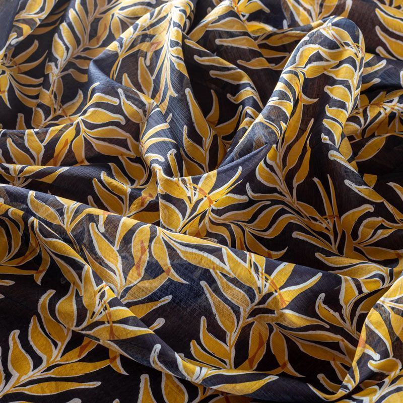 Батист с растительным принтом в молочно-желтых оттенках на темно-синем фоне. Ткань очень легкая, прозрачная, приятная на ощупь, нежная, пластичная, хорошо и мягко драпируется, летящая. Батист подойдёт для модных блуз с объёмными рукавами, летних платьев и сарафанов с длинной летящей юбкой, прозрачных рубашек, декорированных объёмными бантами, туник и топов.