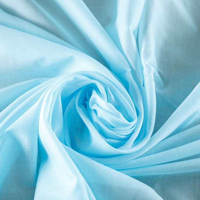 Итальянский хлопковый батист в голубом оттенке, тонкий, легкий, полупрозрачный, приятный на ощупь, нежный, хорошо и мягко драпируется, летящий. Батист подойдёт для модных блуз с объёмными рукавами, летних платьев и сарафанов с длинной летящей юбкой, прозрачных рубашек, декорированных объёмными бантами, детской одежды.