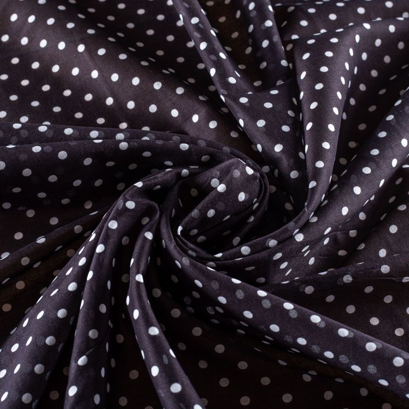 Итальянский хлопковый батист черного цвета с классическим принтом "в горох". Ткань очень легкая, прозрачная, приятная на ощупь, нежная, пластичная, хорошо и мягко драпируется, летящая. Батист подойдёт для модных блуз с объёмными рукавами, летних платьев и сарафанов с длинной летящей юбкой, прозрачных рубашек, декорированных объёмными бантами, туник и топов.