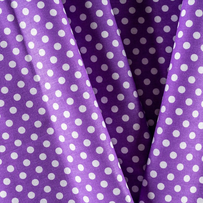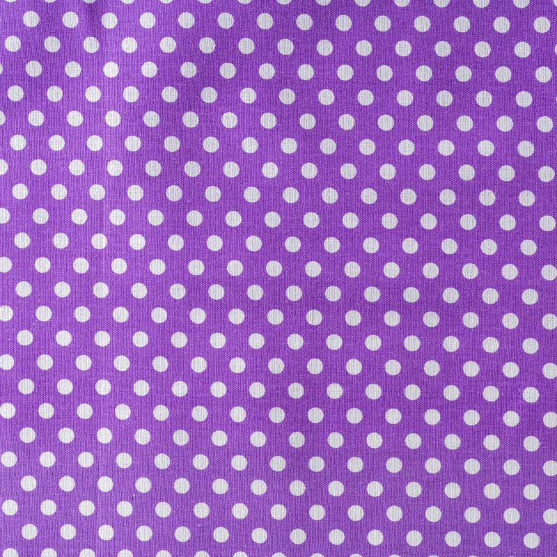 Плотная натуральная ткань с особым принципом переплетения нитей: крест-накрест. Имеет гладкую матовую поверхность чуть шероховатую на ощупь, не тянется, немного просвечивает. Прочная и стойкая к износу, надолго сохраняет яркость красок, не растягивается при стирке, практически не мнется. Мелкий белый горошек (5 мм) на ярком фиолетовом фоне прекрасно подойдет для пошива постельного белья, изготовления пеленок, бортиков для кроватки, домашней одежды и других предметов интерьера.