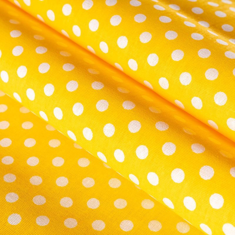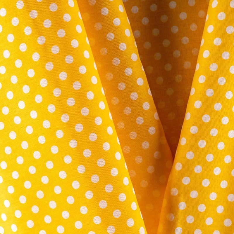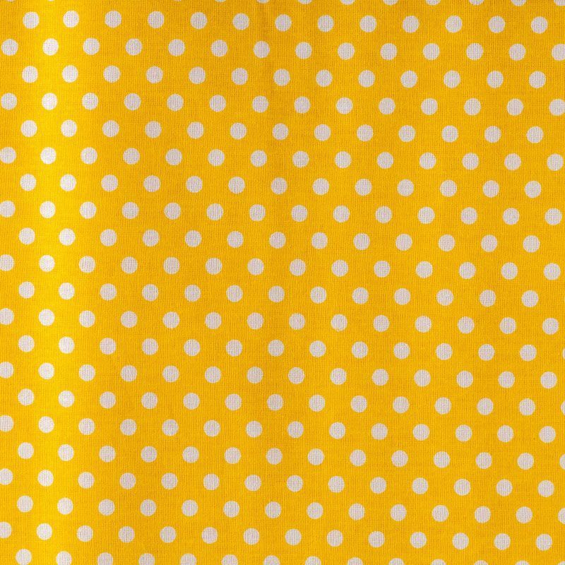 Плотная натуральная ткань с особым принципом переплетения нитей: крест-накрест. Имеет гладкую матовую поверхность чуть шероховатую на ощупь, не тянется, немного просвечивает. Прочная и стойкая к износу, надолго сохраняет яркость красок, не растягивается при стирке, практически не мнется. Мелкий белый горошек (5 мм) на ярком солнечно-желтом фоне прекрасно подойдет для пошива постельного белья, изготовления пеленок, бортиков для кроватки, домашней одежды и других предметов интерьера.