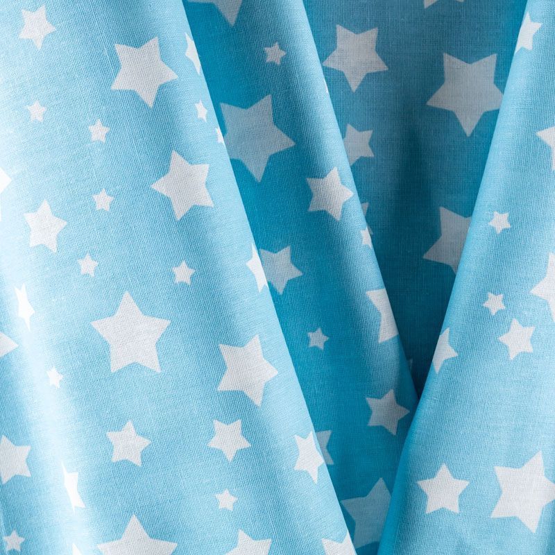Плотная натуральная ткань с особым принципом переплетения нитей: крест-накрест. Имеет гладкую матовую поверхность чуть шероховатую на ощупь, не тянется, немного просвечивает. Прочная и стойкая к износу, надолго сохраняет яркость красок, не растягивается при стирке, практически не мнется. Принт в виде белых звездочек разного размера на небесно-голубом фоне прекрасно подойдет для пошива постельного белья, изготовления пеленок, бортиков для кроватки, домашней одежды и других предметов интерьера.