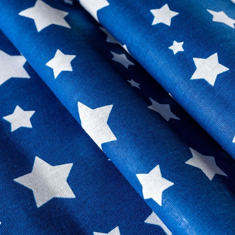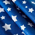 Плотная натуральная ткань с особым принципом переплетения нитей: крест-накрест. Имеет гладкую матовую поверхность чуть шероховатую на ощупь, не тянется, немного просвечивает. Прочная и стойкая к износу, надолго сохраняет яркость красок, не растягивается при стирке, практически не мнется. Принт в виде  белых звездочек разного размера на глубоком синем фоне прекрасно подойдет для пошива постельного белья, изготовления пеленок, бортиков для кроватки, домашней одежды и других предметов интерьера.