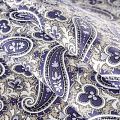 Плотная натуральная ткань с особым принципом переплетения нитей: крест-накрест. Имеет гладкую матовую поверхность, немного шероховатая на ощупь, не тянется, немного просвечивает. Прочная и стойкая к износу, надолго сохраняет яркость красок, практически не мнется. Восточный принт пейсли на спокойном сером фоне прекрасно подойдет для пошива постельного и столового белья, изготовления домашней одежды и других предметов интерьера.