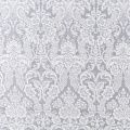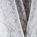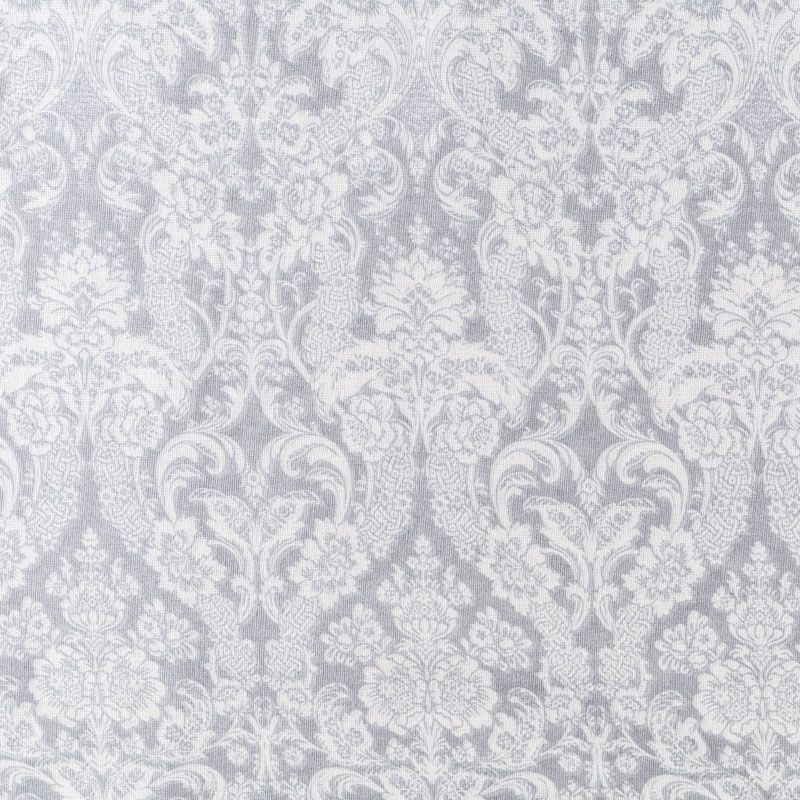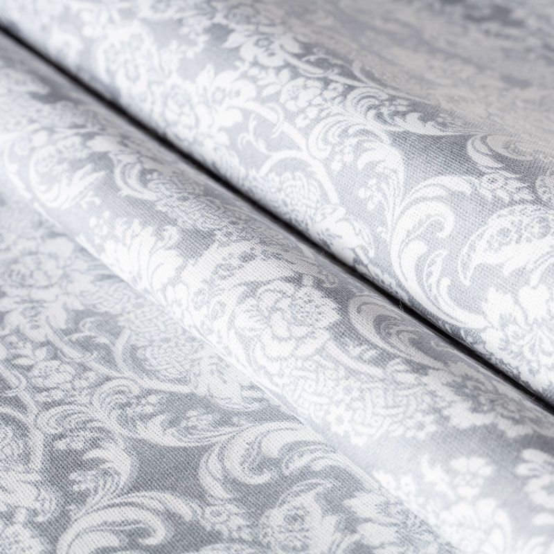 Плотная натуральная ткань с особым принципом переплетения нитей: крест-накрест. Имеет гладкую матовую поверхность, немного шероховатая на ощупь, не тянется, немного просвечивает. Прочная и стойкая к износу, надолго сохраняет яркость красок, практически не мнется. Имитация жаккардового узора на сером фоне прекрасно подойдет для пошива постельного и столового белья, изготовления бортиков для кроватки, домашней одежды и других предметов интерьера.