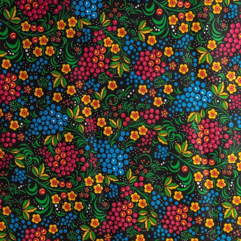 Плотная натуральная ткань с особым принципом переплетения нитей: крест-накрест. Имеет гладкую матовую поверхность, немного шероховатая на ощупь, не тянется, немного просвечивает. Прочная и стойкая к износу, надолго сохраняет яркость красок, практически не мнется. Мелкий цветной растительный принт на черном фоне прекрасно подойдет для пошива постельного и столового белья, изготовления сценических костюмов, домашней одежды и других предметов интерьера.