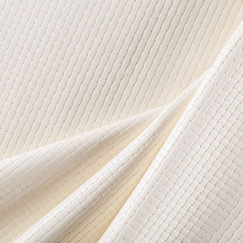 Итальянская экокожа в сливочном оттенке с объемной фактурой в виде плетения. Очень приятная на ощупь, отлично тянется, пластичная. С изнаночной стороны трикотаж белого цвета. Подойдет для пошива платья, брюк, шорт, юбки, куртки, плаща, пальто-рубашки.