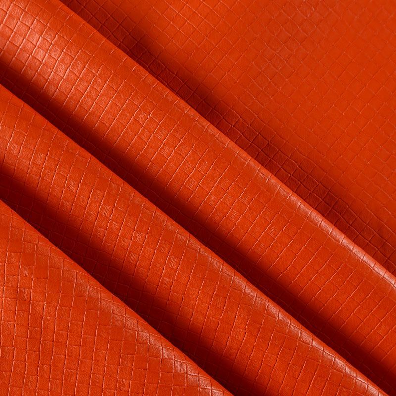 Экокожа в оранжевом оттенке с объемной фактурой, имитирующей плетенку. Очень приятная на ощупь, пластичная. Подойдет для пошива платья, брюк, шорт, юбки, куртки, плаща, пальто-рубашки, а также сумки, рюкзака и других аксессуаров.