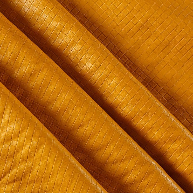 Экокожа в желтом оттенке с объемной фактурой, имитирующей плетенку. Очень приятная на ощупь, пластичная. Подойдет для пошива платья, брюк, шорт, юбки, куртки, плаща, пальто-рубашки, а также сумки, рюкзака и других аксессуаров.