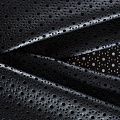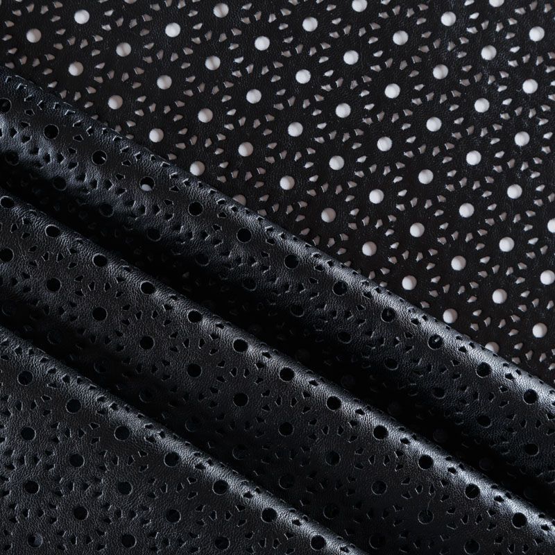 Искусственный материал, имитирующий натуральную кожу, на трикотажной основе. Поверхность матовая, с геометрической лазерной перфорацией. Экокожа тоньше натуральной, не мнется, пластична, тянется, хорошо облегает фигуру. Изнаночная сторона - черный трикотаж. Подойдет для пошива куртки, костюма, платья, юбки, брюк, шорт, комбинезона, сумки, рюкзака.