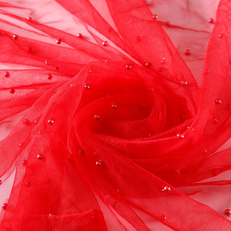 Тонкая прозрачная сетка средней жесткости красного оттенка декорирована не крупными бусинами в тон полотна. Используется для пошива одежды для различных праздников, концертов, пышных юбок, платьев, а также для отделки и украшения, создания предметов декора и украшения помещений для торжественных мероприятий.