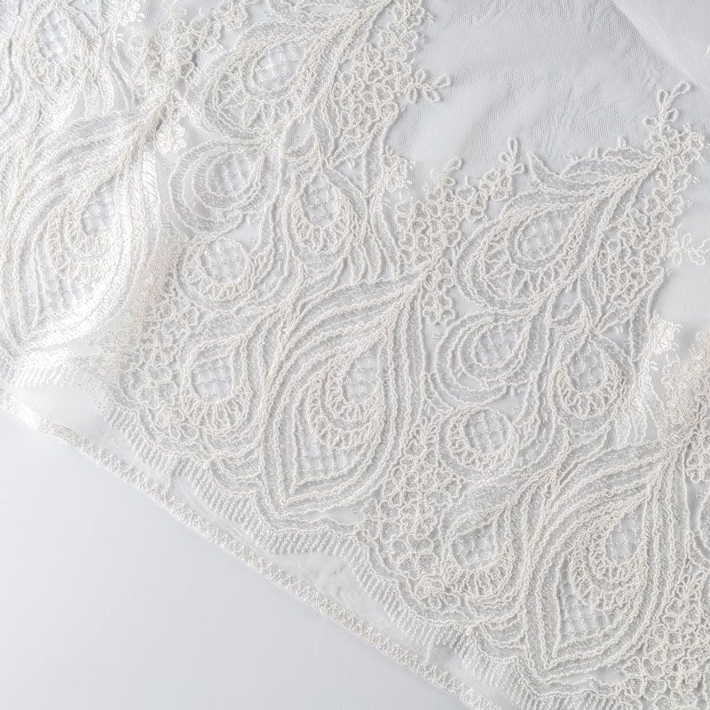 Вышивка на сетке молочного оттенка с крупным фантазийным узором в виде пера жар-птицы. Полотно мягкое, легкое и пластичное, хорошо тянется. Сетка не жесткая, приятная к телу. Узор вышит мягкой пряжей, образуя красивую фактуру, имитирующую ручную вышивку, и оформлен кордовой нитью. С обеих сторон ткань украшена симметричными фестонами, что придает полотну законченный и нарядный вид. Великолепно будет смотреться в нарядном вечернем, свадебном платье, платье на выпускной бал, в блузках, топах. Набирается для изделя объемом.