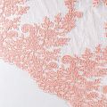 Кружевное полотно на сетчатой жаккардовой основе персиково-розового оттенка с флористическим узором. Тонкое, легкое, очень мягкое и пластичное, хорошо драпируется, приятное тактильно. Вышивка оформлена кордовой нитью. С обеих сторон ткань украшена симметричными фестонами, что придает полотну законченный и нарядный вид. Великолепно будет смотреться в нарядном вечернем, свадебном платье, платье на выпускной бал, в юбках, блузках, топах. Также можно применять отдельные элементы для декора, которые вырезаются из полотна.