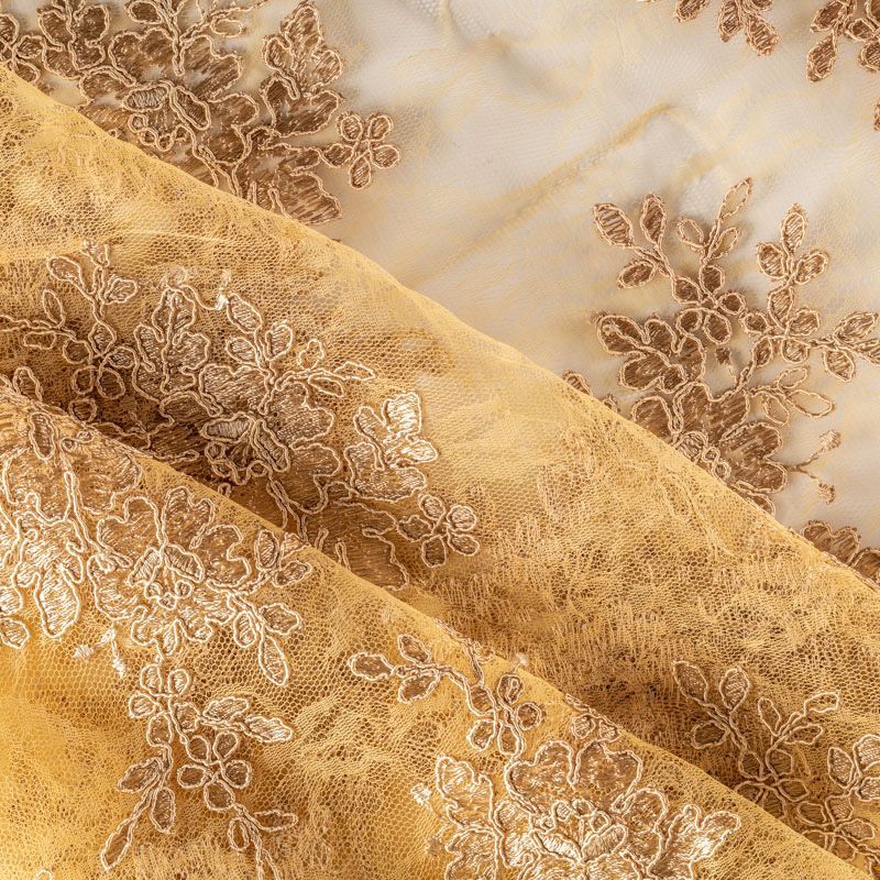 Кружевное полотно на сетчатой жаккардовой основе теплого карамельного оттенка с флористическим узором. Тонкое, легкое, очень мягкое и пластичное, хорошо драпируется, приятное тактильно. Вышивка оформлена кордовой нитью. С обеих сторон ткань украшена симметричными фестонами, что придает полотну законченный и нарядный вид. Великолепно будет смотреться в нарядном вечернем, свадебном платье, платье на выпускной бал, в юбках, блузках, топах. Также можно применять отдельные элементы для декора, которые вырезаются из полотна.