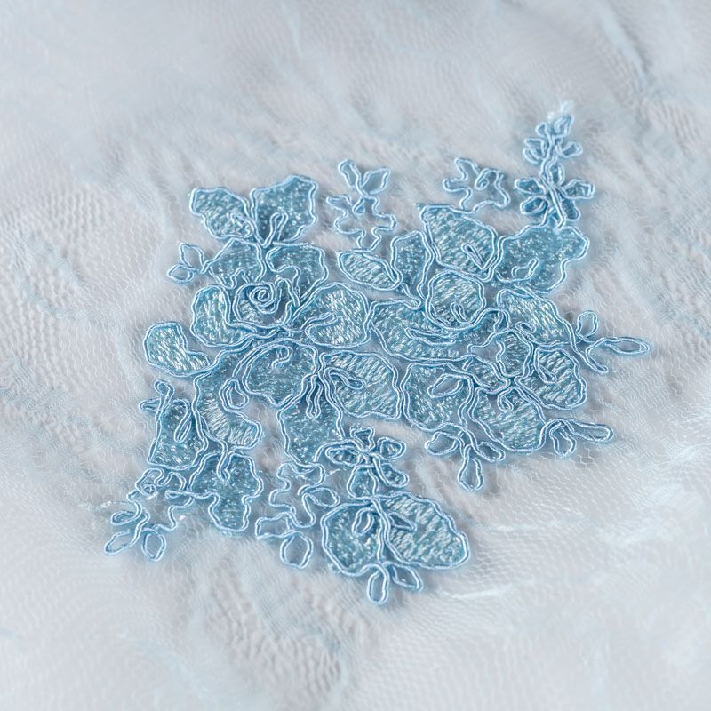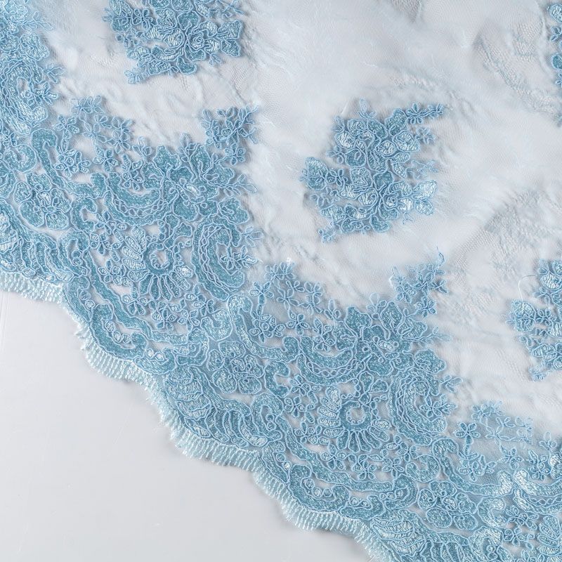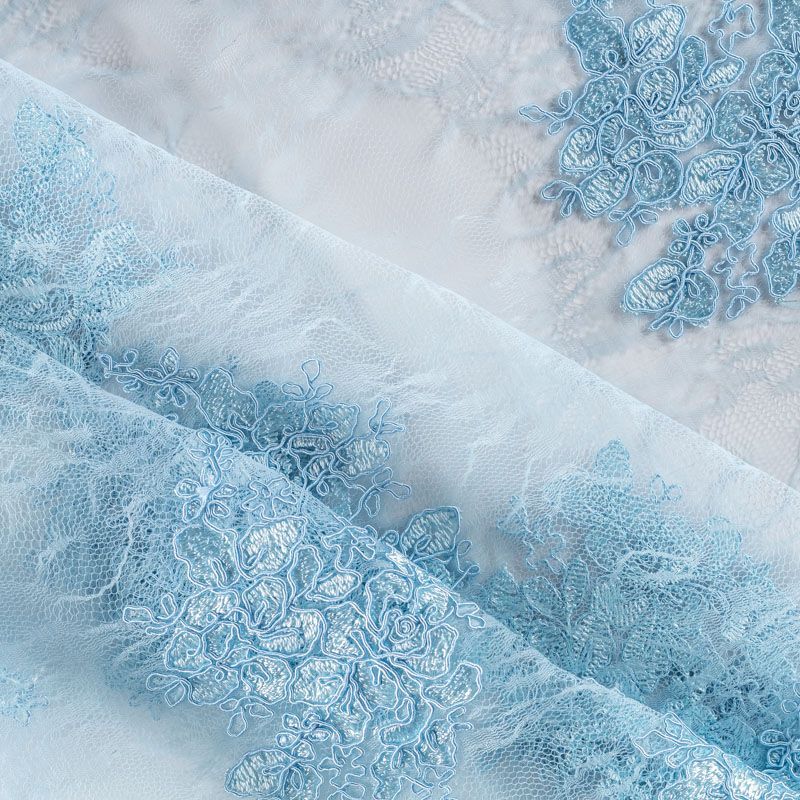 Кружевное полотно на сетчатой жаккардовой основе элегантного серебристо-голубого оттенка с флористическим узором. Тонкое, легкое, очень мягкое и пластичное, хорошо драпируется, приятное тактильно. Вышивка оформлена кордовой нитью. С обеих сторон ткань украшена симметричными фестонами, что придает полотну законченный и нарядный вид. Великолепно будет смотреться в нарядном вечернем, свадебном платье, платье на выпускной бал, в юбках, блузках, топах. Также можно применять отдельные элементы для декора, которые вырезаются из полотна.