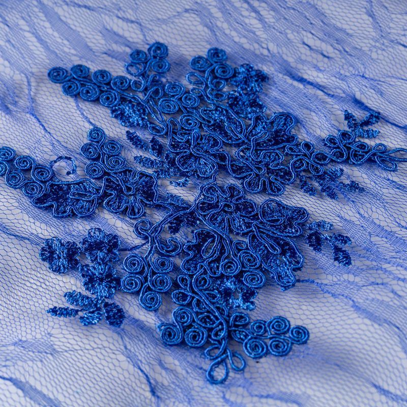 Кружевное полотно на сетчатой жаккардовой основе насыщенного синего оттенка с флористическим узором. Тонкое, легкое, очень мягкое и пластичное, хорошо драпируется, приятное тактильно. Вышивка оформлена кордовой нитью. С обеих сторон ткань украшена симметричными фестонами, что придает полотну законченный и нарядный вид. Великолепно будет смотреться в нарядном вечернем, свадебном платье, платье на выпускной бал, в юбках, блузках, топах. Также можно применять отдельные элементы для декора, которые вырезаются из полотна.