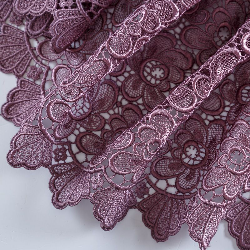 Гипюр-макраме представляет собой ажурное полотно, имеющее рельефную текстуру с цветочным ажурным плетением по всей ширине и фестонами по обе стороны кромок. Материал прозрачный на теле и на просвет, требуется подклад. Всегда актуален при создании утончённых и роскошных нарядов, придавая им дороговизны и оригинальности. Может использоваться для пошива платьев, костюмов прямого кроя, изготовления декоративных элеметов. Набирается на изделие объемом.