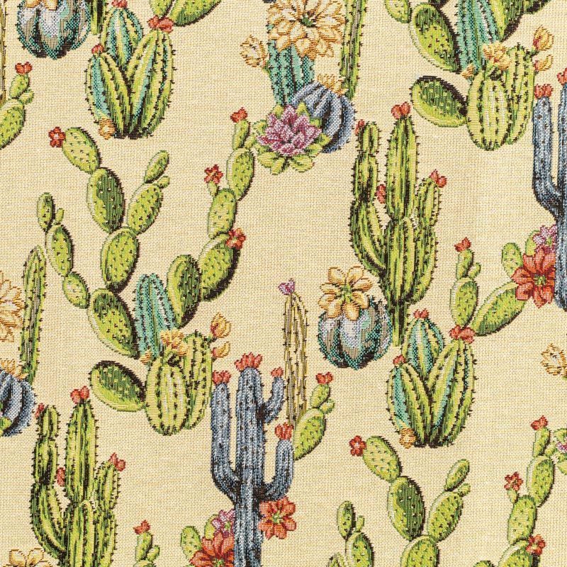 Гобелен представляет собой ткань, выполненную  перекрестным плетением нитей с одномоментным созданием сюжетной или орнаментальной композиции. Это плотный материал высокую прочность и износостойкость. Гобелен используют для пошива плотных светонепроницаемых штор, декоративного домашнего текстиля и аксессуаров, в мебельном производстве для обивки мебели. Так же применяется в рукоделии: модные кошельки, сумочки, пояса и другие аксессуары и при изготовлении дизайнерской одежды. На спокойном песочно-бежевом фоне, как в пустыне, зацвели кактусы.