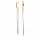 Иглы с округленным острием и большим ушком для протягивания резинки и тесьмы, эластичных лент и шнуров через пояс брюк, капюшон и т.п. Версия из латуни является разделенной в стержневой части, открытой к ушку иглой, причем острие иглы скруглено в форме шара. Если заправить в это ушко ленту и затем протянуть ее между половинами стержня иглы вниз, то она будет зажата, и после этого ее, когда она прочно зафиксирована, можно протянуть через кулиску. Другая игла для протягивания из нержавеющей стали также является тупой иглой. Но у нее широкий, и за счет этого более тонкий стержень с одним длинным и одним круглым ушком. Длинное ушко при этом предназначено для лент и толстых ниток, а круглое подходит для более тонких ниток и круглых резинок. Скругленное острие игл не может проткнуть ткань и поэтому легко скользит по любой тканевой кулиске. Сбалансированный коэффициент жесткости пружины и поверхность с гладким покрытием превращают эти иглы в профессиональные инструменты. Длина игл: 6.5 см и 7 см.