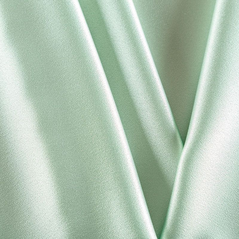 Итальянская ткань кади мятного оттенка. Кади — это креп-атлас с красивым глянцевым блеском. Ткань с плотной фактурой, роскошно ниспадает, очень хорошо тянется, изумительно садится по фигуре и шикарно смотрится в изделии. Она хорошо драпируется, эффектно облегает. Подходит для пошива удлиненных платьев с драпировками, платья-футляра, брюк палаццо, юбки-карандаш, жакета, туники, кроп-топа, а также для вечерних, свадебных и  выпускных платьев и костюмов.