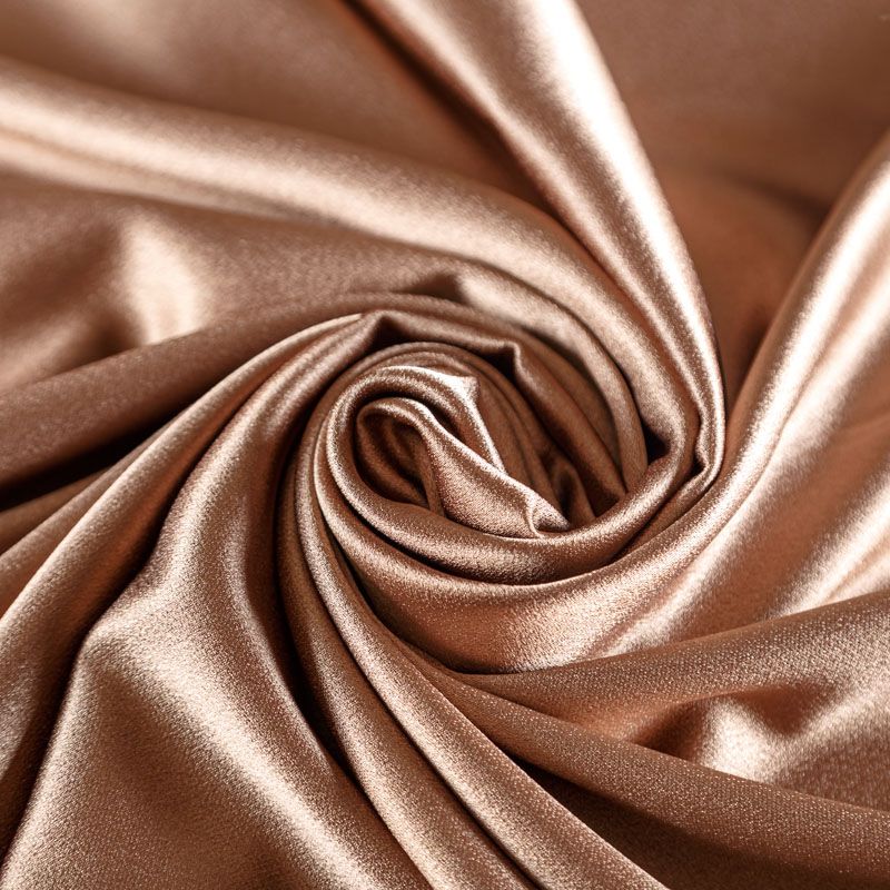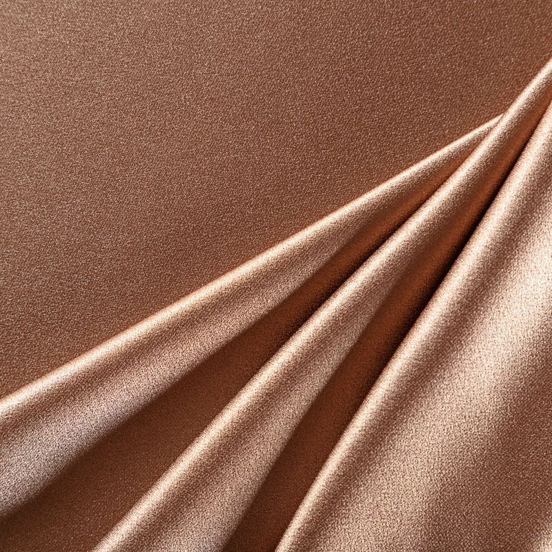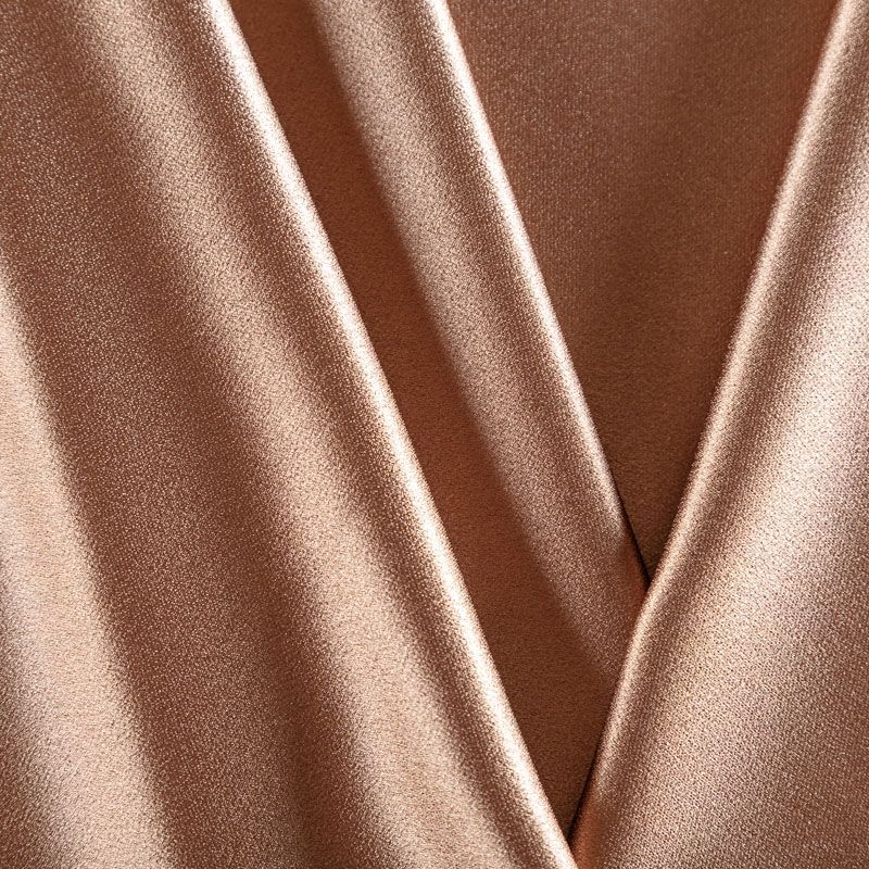 Итальянская ткань кади бронзового оттенка. Кади — это креп-атлас с красивым глянцевым блеском. Ткань с плотной фактурой, роскошно ниспадает, очень хорошо тянется, изумительно садится по фигуре и шикарно смотрится в изделии. Она хорошо драпируется, эффектно облегает. Подходит для пошива удлиненных платьев с драпировками, платья-футляра, брюк палаццо, юбки-карандаш, жакета, туники, кроп-топа, а также для вечерних, свадебных и  выпускных платьев и костюмов.