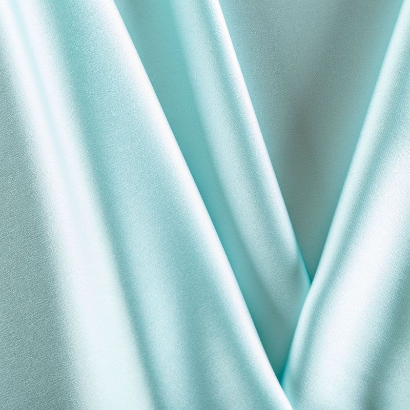 Итальянская ткань кади ментолового оттенка. Кади — это креп-атлас с красивым глянцевым блеском. Ткань с плотной фактурой, роскошно ниспадает, очень хорошо тянется, изумительно садится по фигуре и шикарно смотрится в изделии. Она хорошо драпируется, эффектно облегает. Подходит для пошива удлиненных платьев с драпировками, платья-футляра, брюк палаццо, юбки-карандаш, жакета, туники, кроп-топа, а также для вечерних, свадебных и  выпускных платьев и костюмов.