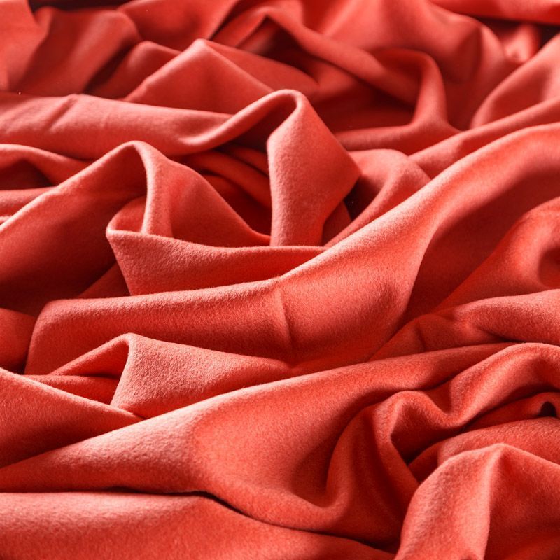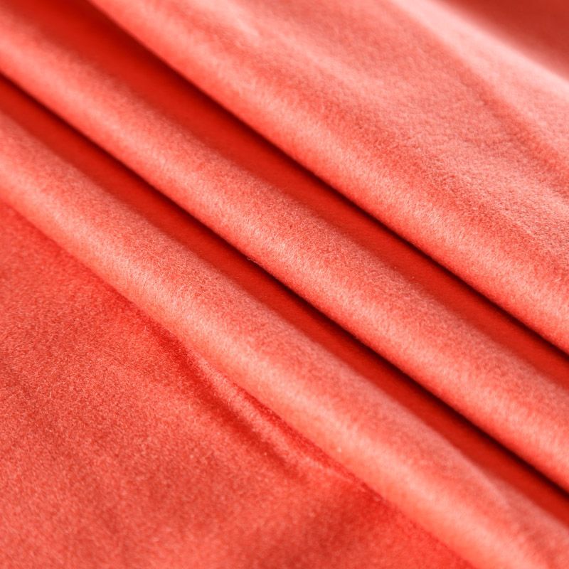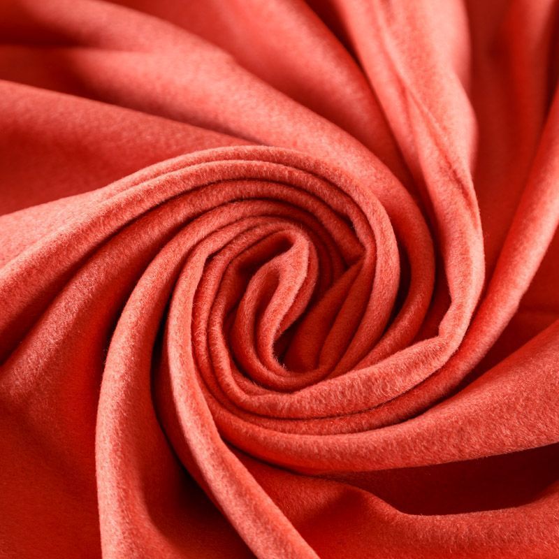 Итальянский пальтовый кашемир кораллового оттенка. Ткань мягкая, пластичная, приятная на ощупь, гибкая, средней толщины, при этом высокой плотности. Поверхность имеет короткий ворс. Подойдет для пошива пальто, куртки, жакета, парки, кейпа, жакета или пончо.