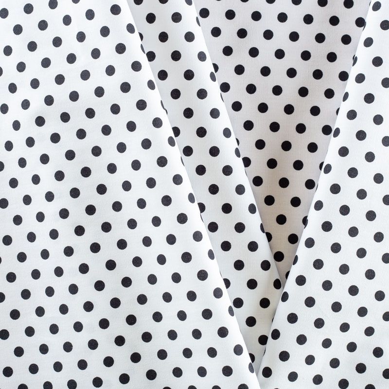 Плательно-блузочная ткань из натурального хлопка с принтом горох. Ткань легкая, тонкая, хорошо "дышит", мягкая, не прозрачная, немного тянется за счет эластана в составе. Подойдет для пошива летнего платья, летящей юбки, блузы, сарафана, комбинезона или рубашки.