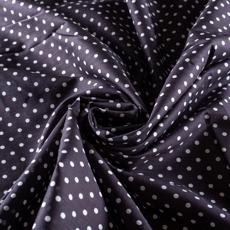 Итальянский плательно-рубашечный хлопок черного цвета в белый горошек. Ткань мягкая, лёгкая, непрозрачная, пластичная и приятная к телу, хорошо драпируется, имеет гладкую матовую поверхность и сатиновое плетение. Прекрасно подойдет как для пошива платья-рубашки, сарафана, платьев различных фасонов, туники, топа, летнего костюма, комбинезона, мужской и детской одежды.