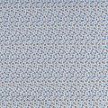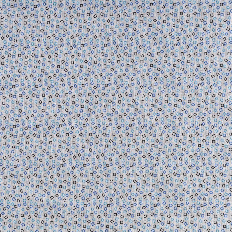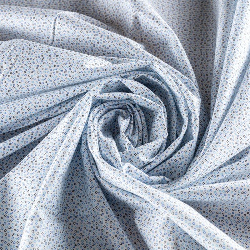 Ткань мягкая, тонкая, лёгкая, непрозрачная, поверхность матовая, приятная к телу, хорошо драпируется. По назначению - рубашечная, для юбки, платья, сарафана, туники. На белом фоне мелкий геометрический рисунок голубого, синего и черного цветов.