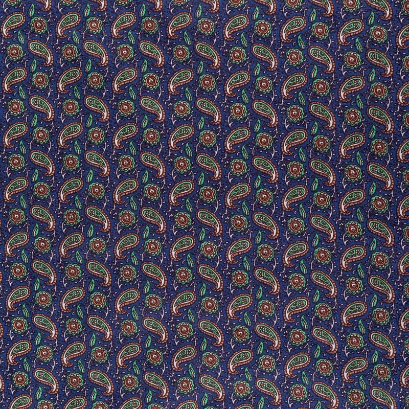 Рубашечно-плательный натуральный хлопок с узором пейсли в зеленых и терракотовых тонах на насыщенном чернильном фоне. Ткань имеет плотное переплетение, матовую гладкую поверхность, хорошо держит форму, не прозрачная. Подойдет для пошива мужских рубашек, платья-рубашки, юбки, сарафана, туники.