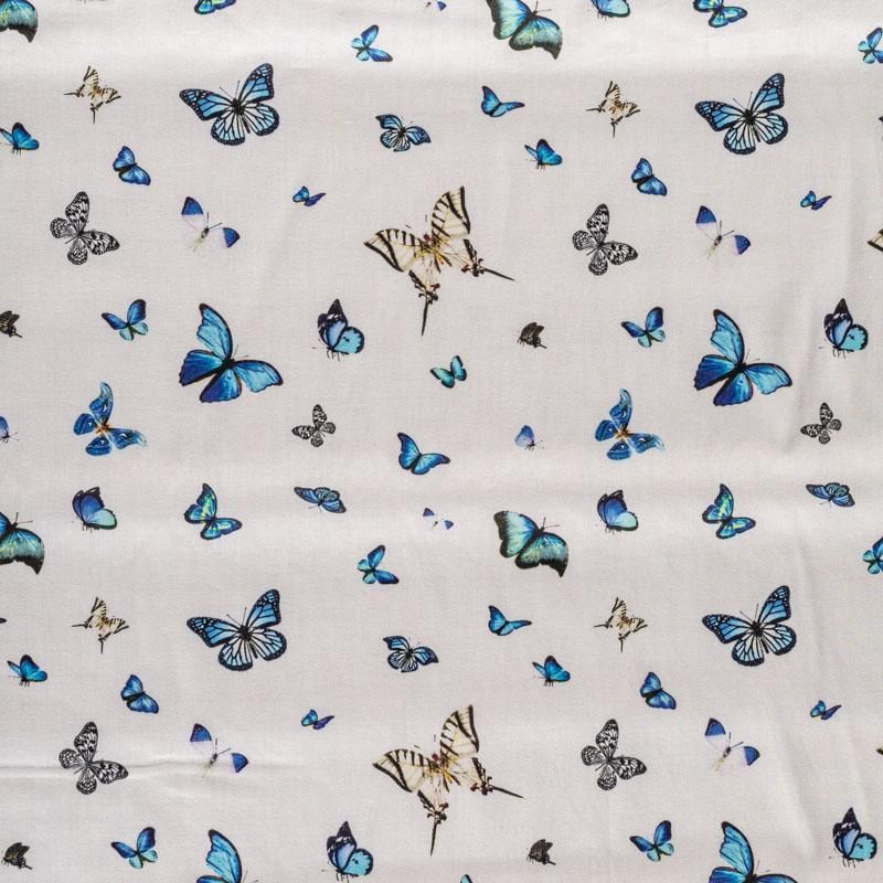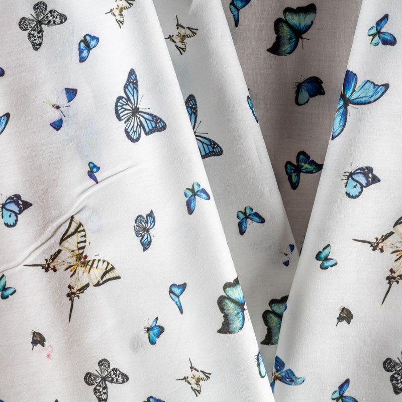Итальянский натуральный хлопок с милым нежным рисунком в виде сине-голубых летающих бабочек. Ткань легкая, тонкая, хорошо "дышит", мягкая, слегка прозрачная, по плотности напоминает батист. Подойдет для пошива домашней одежды, детских летних платьев, песочников, юбки, сарафана или рубашки, а также для для пошива постельных принадлежностей, подушек, покрывал, скрапбукинга, корзин и других видов творчества.