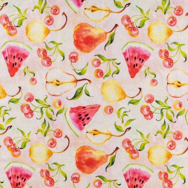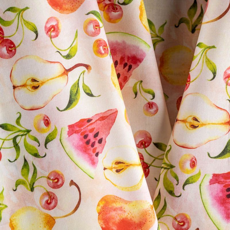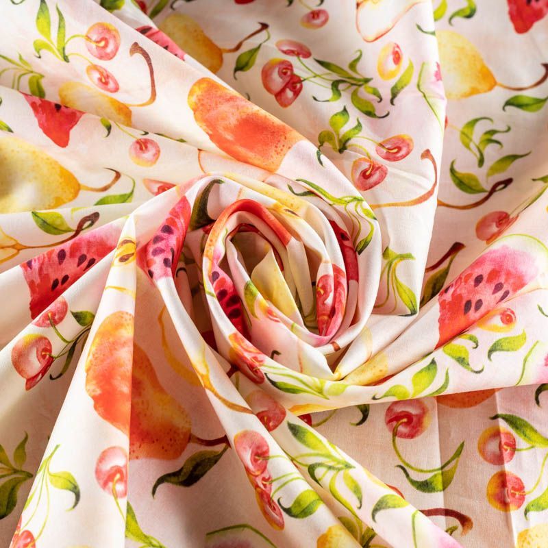 Итальянский натуральный хлопок с милым сочным фруктовым принтом в нежных тонах. Ткань легкая, тонкая, хорошо "дышит", мягкая, слегка прозрачная, по плотности напоминает батист. Подойдет для пошива домашней одежды, детских летних платьев, песочников, юбки, сарафана или рубашки, а также для для пошива постельных принадлежностей, подушек, покрывал, скрапбукинга, корзин и других видов творчества.