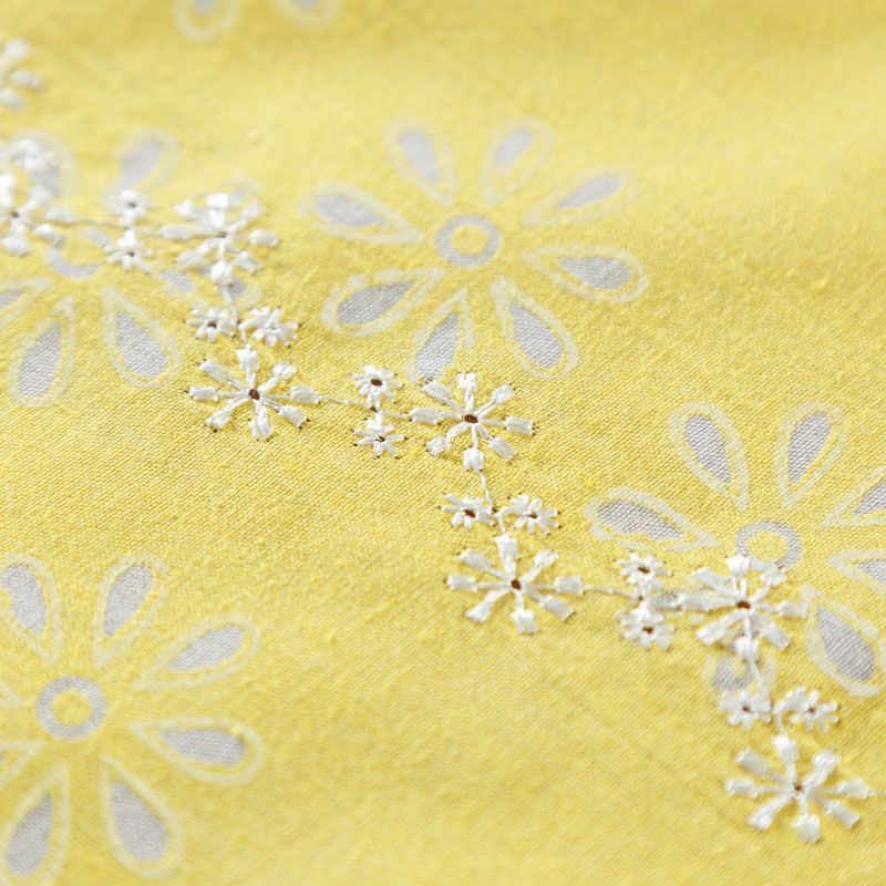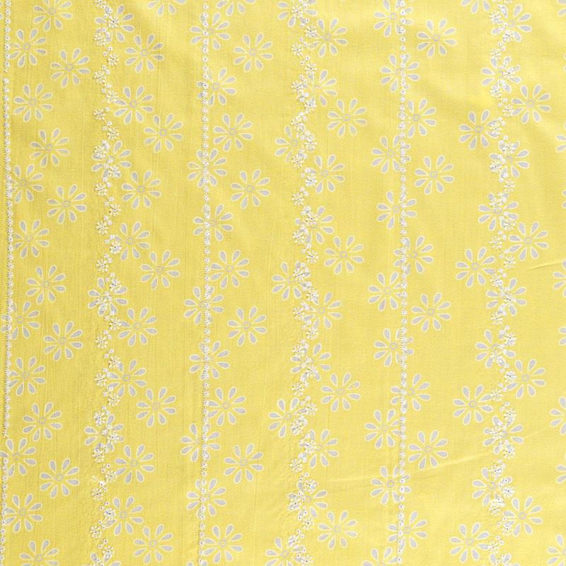 Итальянский плательно-блузочный хлопок лимонно-желтого оттенка с эффектом деворе декорирован изящной цветочной вышивкой. Полотно легкое, мягкое, слегка просвечивает, очень нежное и пластичное. Материал отлично драпируется, формируя мягкие складки. Подойдет для любых моделей платьев, сарафанов, а также юбки, туники, топа с воланами, платье-рубашки.