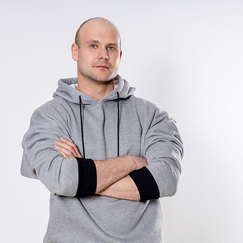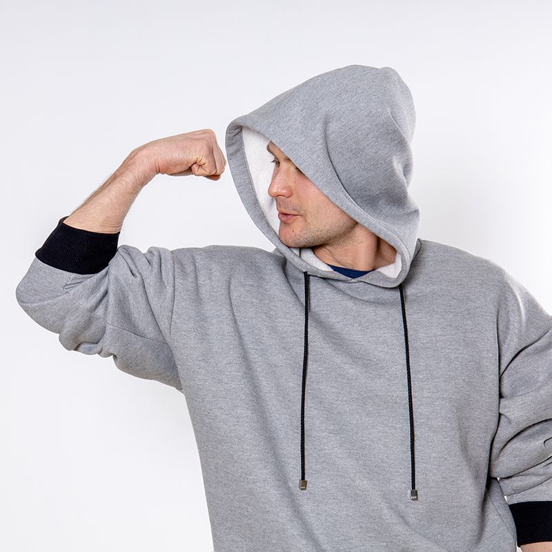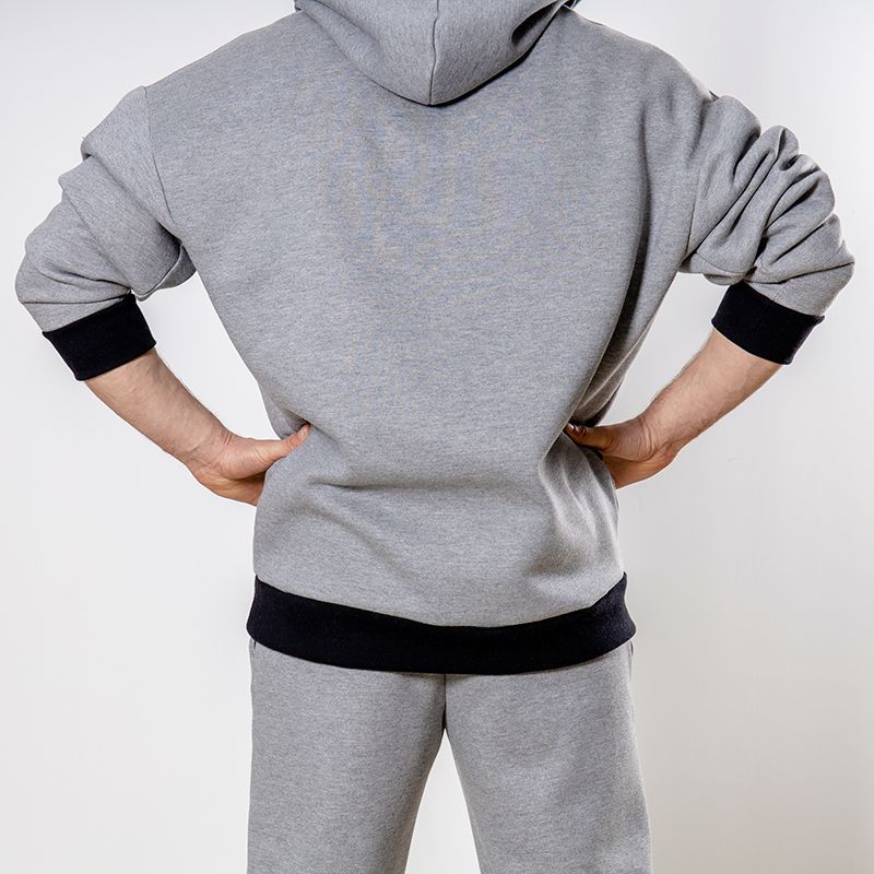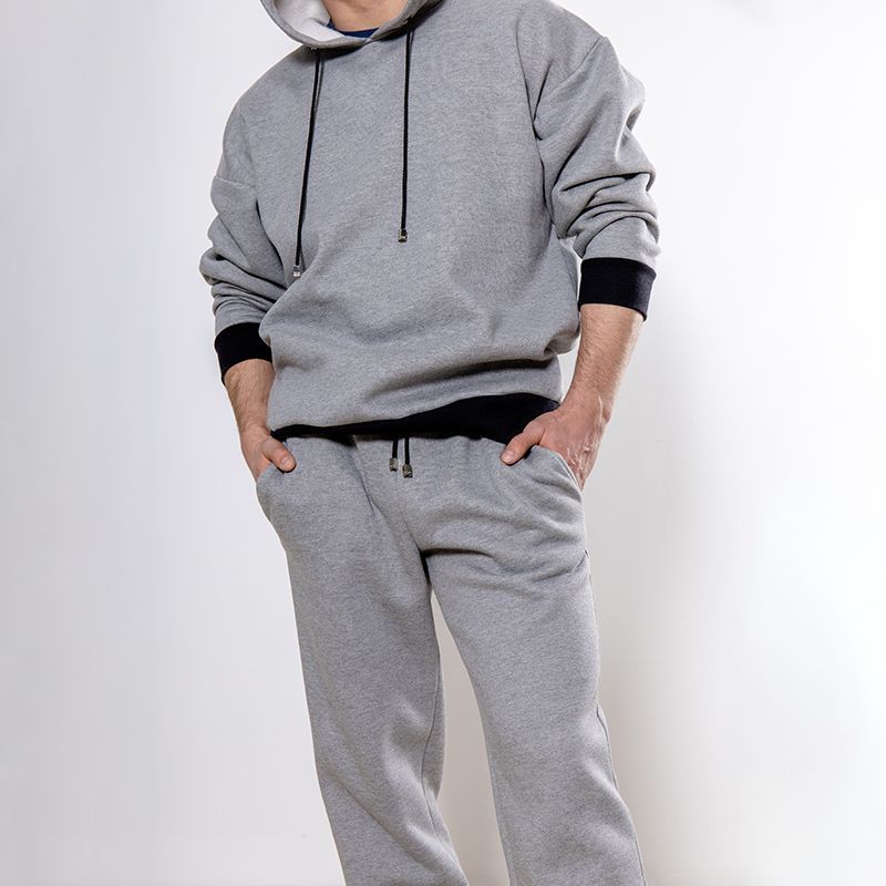 Мужской костюм из 3-х ниточного футера с начесом серого цвета. Комплект состоит из худи и штанов. Худи с капюшоном, который фиксируется на шнурок с металлическими наконечниками. Рукава спущенные. Контрастные манжеты на рукавах, штанах и низ худи выполнены из хлопкового кашкорсе черного цвета. Штаны свободной посадки, в поясе - резинка и дополнительная фиксация на шнурок под завязку. Карманы расположены в отрезных бочках. Костюм предназначен для прогулок, активного отдыха и занятий спортом.
