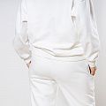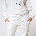 Женский костюм из 3-х ниточного футера с начесом белоснежного цвета. Комплект состоит из худи и штанов. Худи с капюшоном, который фиксируется на шнурок с металлическими наконечниками. Рукава спущенные. Манжеты на рукавах, штанах и низ худи выполнены из хлопкового кашкорсе в цвет костюма. Штаны свободной посадки, в поясе - резинка и дополнительная фиксация на шнурок под завязку. Карманы расположены в боковых швах. Костюм предназначен для прогулок, активного отдыха и занятий спортом.