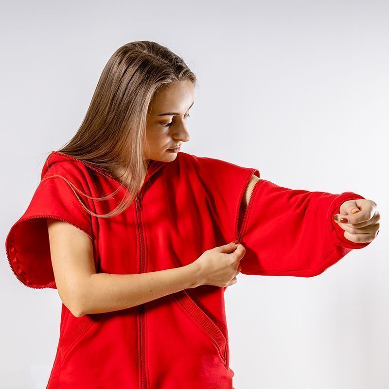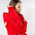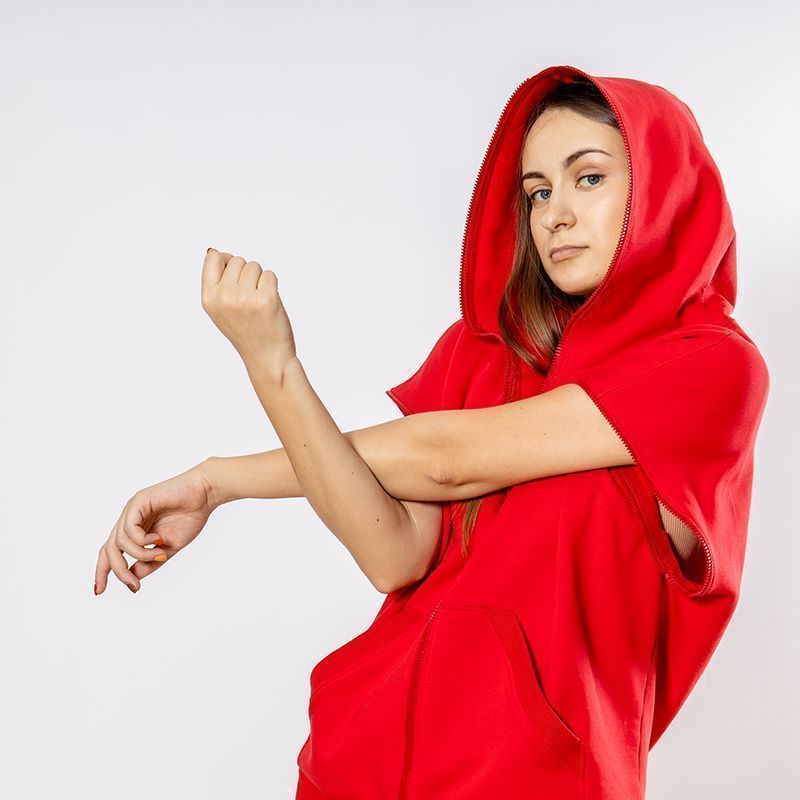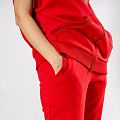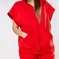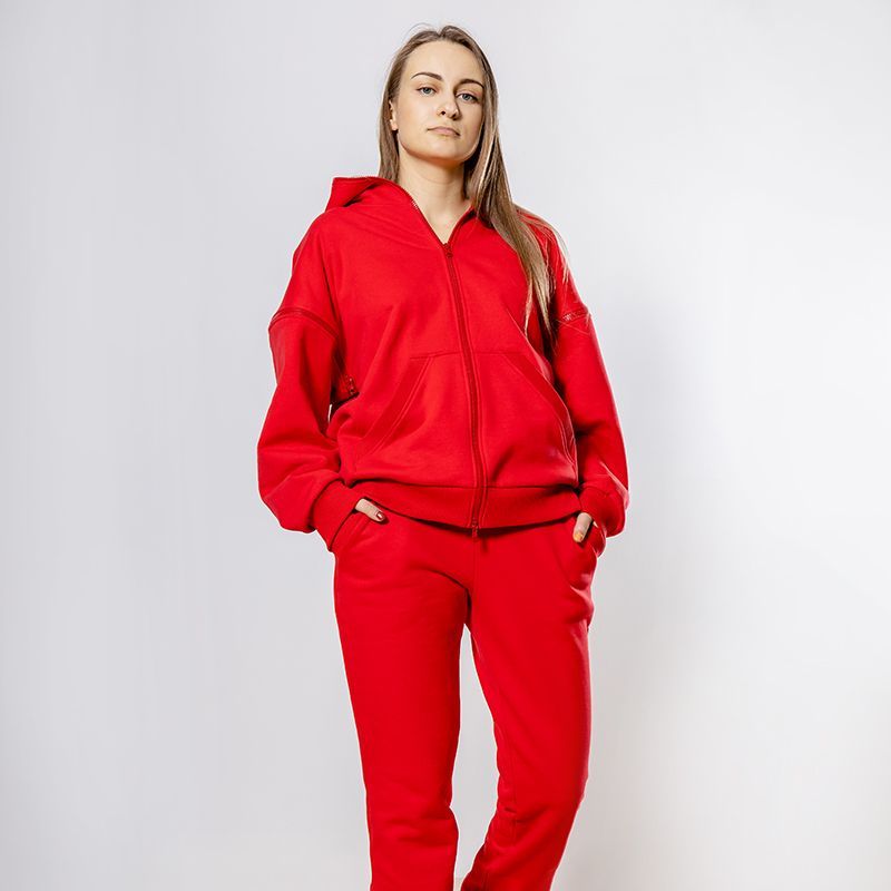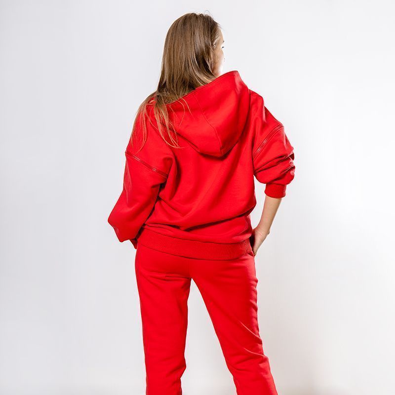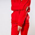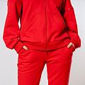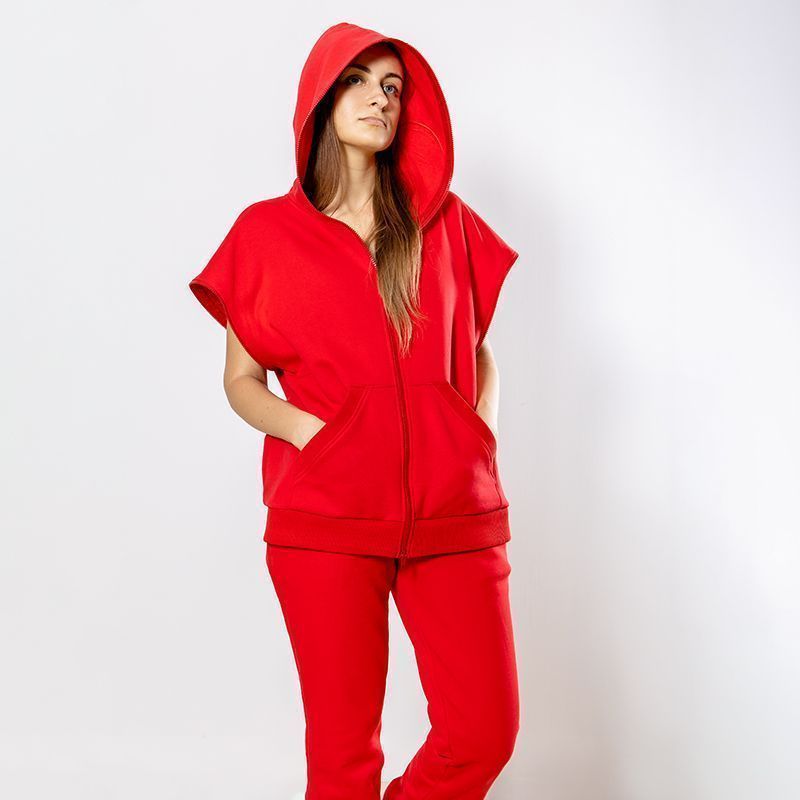 Женский костюм из 3-х ниточного футера с начесом красного цвета. Комплект состоит из худи и штанов. Худи с капюшоном и застежкой на молнию, которая закрывается до конца капюшона. Два накладных кармана "кенгуру". Рукава съемные, на молниях, что превращает худи в жилет. Манжеты на рукавах, штанах и низ худи выполнены из хлопкового кашкорсе в цвет костюма. Штаны свободной посадки, в поясе - резинка и дополнительная фиксация на шнурок под завязку. Карманы с отрезным бочком. Костюм предназначен для прогулок, активного отдыха и занятий спортом.