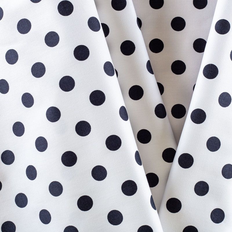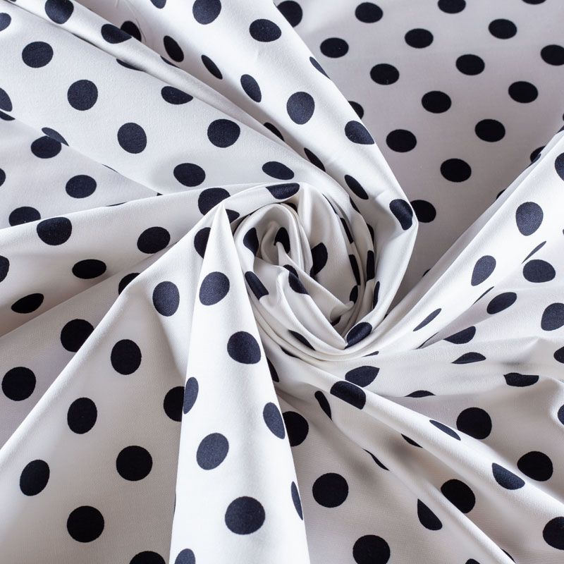 Итальянский костюмно-плательный хлопок белого цвета в черный горох. Ткань приятная на ощупь тянется за счет эластана в составе, непрозрачная, средней плотности, поверхность гладкая, матовая. Подойдет для пошива костюма, жакета, юбки, платья и других изделий на весенне-летний сезон.