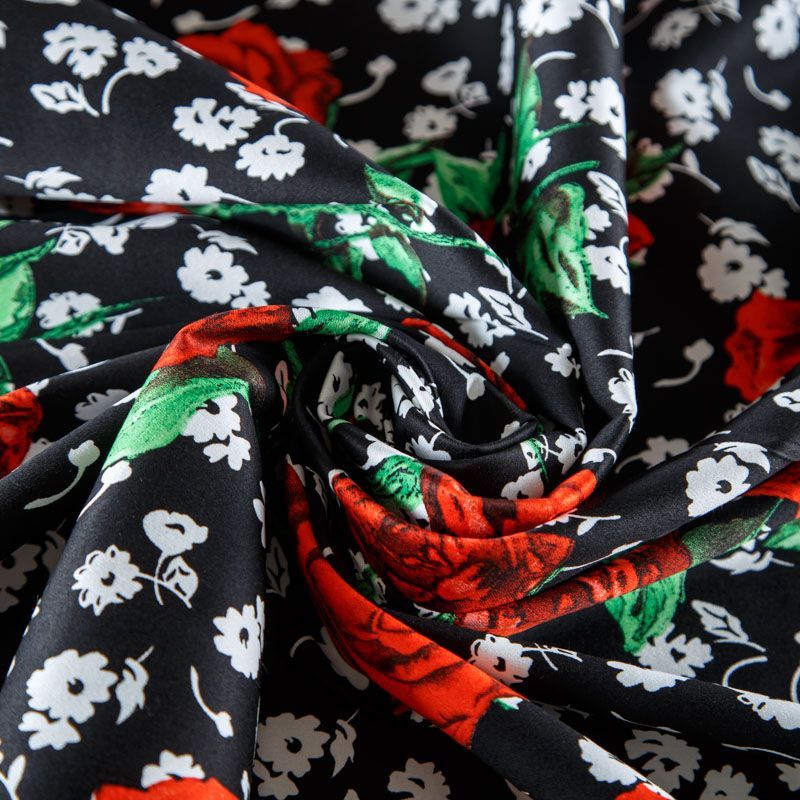 Коттон черного цвета с ярким цветочным принтом. Поверхность гладкая, матовая, ткань средней плотности,  не толстая, хорошо держит форму, тянется за счет эластана в составе. Подойдет для пошива костюма, жакета, юбки, платья, брюк или шорт.
