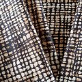 Итальянский коттон бежевого цвета с абстрактным принтом. Поверхность гладкая, матовая, ткань средней плотности,  не толстая, хорошо держит форму, тянется за счет эластана в составе. Подойдет для пошива костюма, жакета, юбки, платья, брюк или шорт.