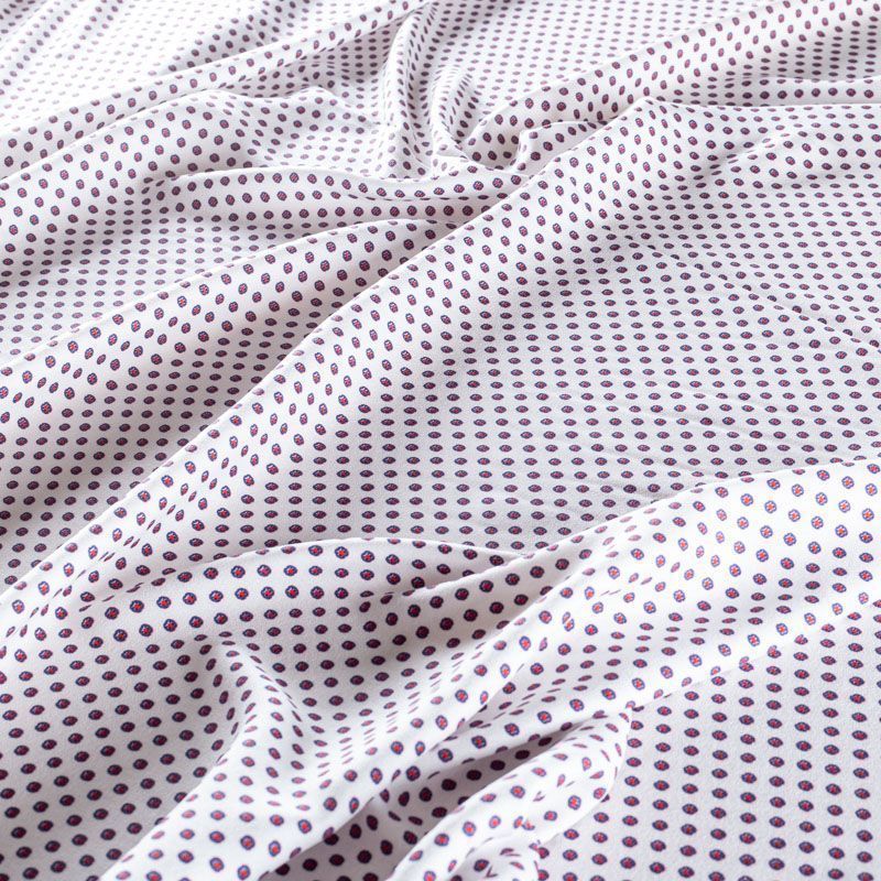 Натуральная вискозная ткань белого оттенка с цветным геометрическим мелким принтом. Легкая, хорошо тянется, драпируется струящимися складками, приятная и комфортная в носке. Материал слегка мнется имеет креповую фактуру. Идеально подходит для пошива  платьев, юбок, блуз, комбинезонов.
