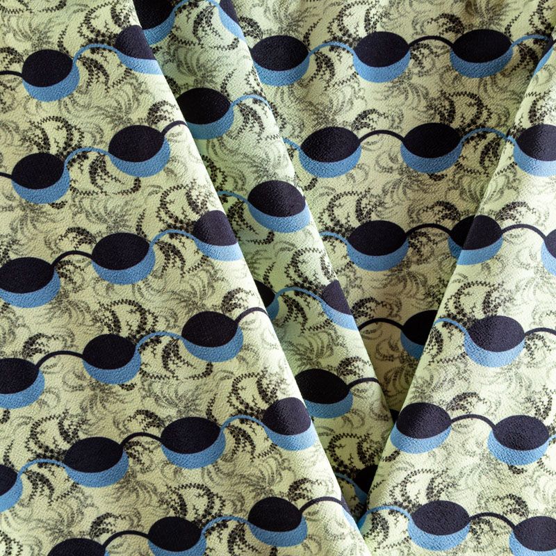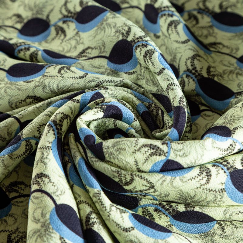 Итальянский вискозный креп плательной плотности светло-серого цвета с абстрактно-геометрическим принтом в сине-голубых оттенках. Поверхность матовая и фактурная, ткань малосминаемая, красиво драпируется, струится и дает объемную складку, не просвечивает.Идеально подойдет для шикарного платья, блузы, юбки, комбинезона, брюк свободного кроя.