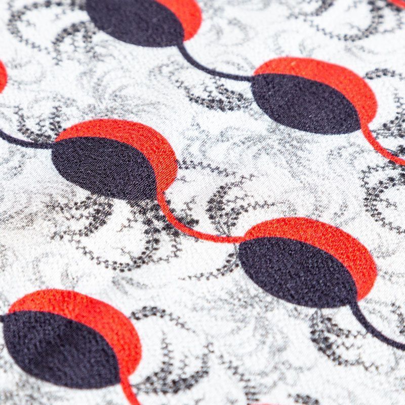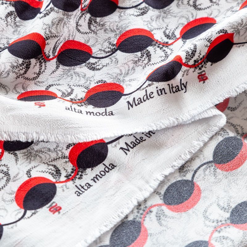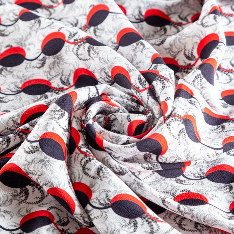 Итальянский вискозный креп плательной плотности светло-серого цвета с абстрактно-геометрическим принтом в черно-красных оттенках. Поверхность матовая и фактурная, ткань малосминаемая, красиво драпируется, струится и дает объемную складку, не просвечивает.Идеально подойдет для шикарного платья, блузы, юбки, комбинезона, брюк свободного кроя.